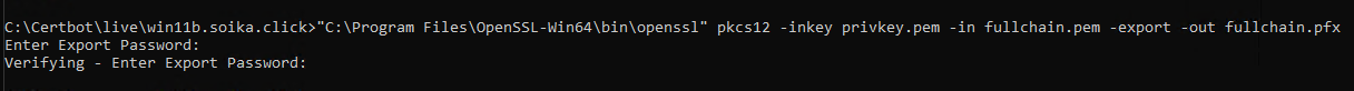"C:\Program Files\OpenSSL-Win64\bin\openssl" pkcs12 -inkey privkey.pem -in fullchain.pem -export -out fullchain.pfx