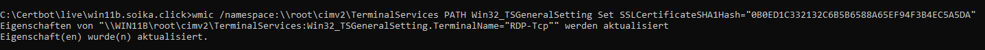 wmic /namespace:\\root\cimv2\TerminalServices PATH Win32_TSGeneralSetting Set SSLCertificateSHA1Hash="0B0ED1C332132C6B5B6588A65EF94F3B4EC5A5DA"